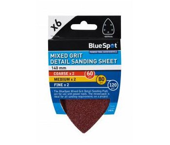 The BlueSpot Mixed Grit Detail Sanding Sheets are for use with detail sanders. The mixed pack is ideal for the majority of sanding requirements on a project.