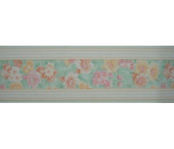 5791 Fiori Country Border. Orange and white stripes with orange circles on upper and lower edges. Pink, red and orange flowers with minty green leaves in the foreground. 10m in length, 4.7cm in height. pattern repeat 13cm.
