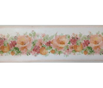 This border is a stylish addition to any home decor, featuring a floral fruit pattern in shades of peach, green, pink, orange, and off white.