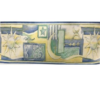 The CDB7274 Country Decor Sun Moon Stars Design Vinyl Border is a stylish addition to any room, featuring a beautiful sun, moon, and stars pattern in shades of yellow, blue, green, and off white.