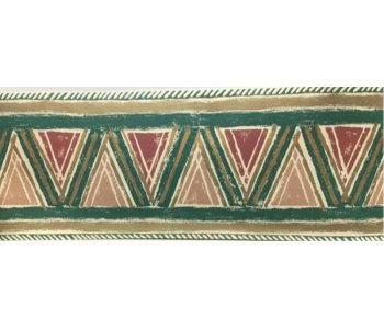 The DES 22889 Crown Triangles and Stripes Design Vinyl Border is a stylish wallpaper border featuring a unique triangular pattern in shades of green, wine, dusky pink, gold, and pale pink.