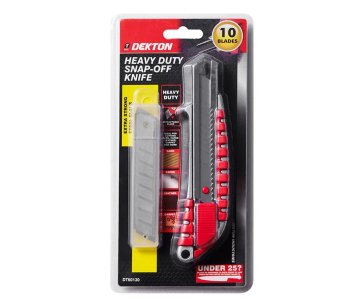 DT60130 DEKTON HEAVY DUTY SNAP OFF KNIFE & 10 BLADES Ideal for cutting card, paper, leather, carpet and more. Lightweight and strong. Snap off blade. Retractable for safety