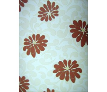 A spongeable, peelable wallpaper with good lightfastness. Cream diagonal striped background with beige decor behind red flowers outlined in gold.