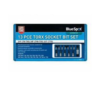 The BlueSpot 13 PCE Torx Socket Bit Set (T8-T70) (1/2", 3/8", 1/4") is manufactured from chrome vanadium for increased durability. Features knurled sockets to provide a secure grip. Complete with a useful carrying case for quick and easy storage.
