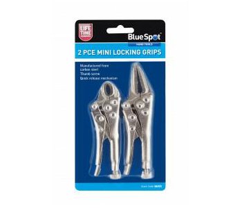 The BlueSpot 2 PCE 100mm & 125mm (4" & 5") Mini Locking Plier Set is manufactured from nickel-plated steel for increased durability. The set comprises of a 100mm (4") mini curved locking grip and a long nose 125mm (5"). Both feature a thumb screw for easy adjustment and a quick release.