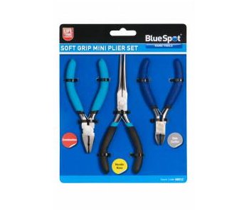 The Blue Spot Tools 3 Piece Soft Grip Mini Plier Set is manufactured from high-quality carbon steel for increased durability. Features soft grip handles for increased comfort. Double leaf-springs allow jaws to open automatically. Set includes combination, needle nose and side cutter pliers.