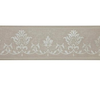 The image depicts a decorative border featuring a classic and elegant design. The primary motif is a repeating pattern of stylized floral elements, each resembling an ornate acanthus leaf or floral emblem. These elements are rendered in a light, almost white colour, creating a subtle contrast against the slightly textured, beige or light taupe background.