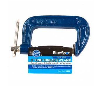 The BlueSpot 75mm Fine Thread G-Clamp is manufactured with a malleable cast iron frame and a fine thread with reinforced shoulders for increased durability. Features tommy bar handle and steel swivel screw. Ball and socket head for maximum contact on uneven surfaces.