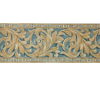 10metre Broomhill Venecia Wallpaper Border in a light beige twirl leaf design with a light blue background.