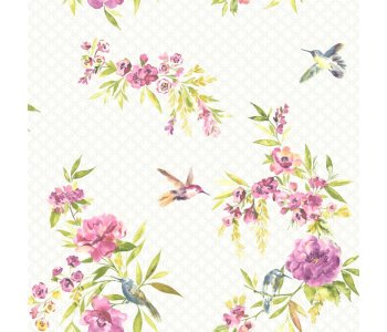 Featuring a whimsical design of hummingbirds and delicate florals intertwined with a subtle geometric pattern, this wallpaper exudes elegance and charm.