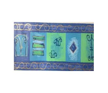 1335 Pride Wallpaper Border. Border in blue's and green with different modern designs. Pattern repeat 37.5cm. 8 meters in length.13.5cm in height.