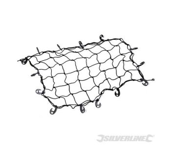 140820 Cargo Net. Durable 5mm thick elastic webbing keeps loose items secure during transit. 6 plastic-coated steel hooks with protective rubber caps. Ideal for securing small items on motorbikes, bicycles and backpacks.