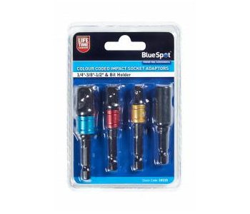 The BlueSpot Colour Coded Impact Socket Adaptors (1/4"-3/8"-1/2") & Bit Holder are manufactured from chrome vanadium for increased durability. The colour coded collars enable quick selection of the adaptor you want. Features ball bearing for a secure hold. Includes a magnetic bit holder.