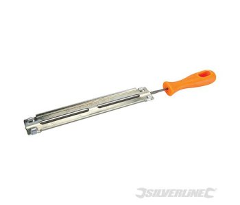 Chainsaw File. Round file designed for sharpening chainsaw chains quickly and accurately. Attached guide plate holds file at correct depth, clear markings for easy angle alignment.