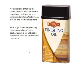 Liberon Finishing Oil is a blend of high quality oils for use on all interior wood, turned woodwork and wooden toys. It is suitable for use on worktops, kitchen tables and bathroom furniture and can also be applied to cork, stone and terracotta. It nourishes and enhances the colour of wood, and ideal for surfaces requiring a hard wearing and water-resistant finish. It can be used to provide matt, satin or gloss finishes, dependant upon the number of coats applied.
