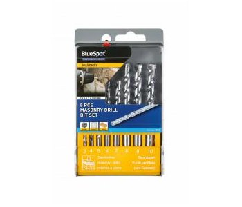 The BlueSpot 8 Piece Masonry Drill Bit Set is zinc plated with carbide tips for increased durability. Ideal for fast drilling of a plug, anchor or clearance holes in a variety of materials including masonry, stone, concrete and brick/block. Includes handy carrying case for quick and convenient storage.