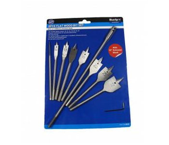 The BlueSpot 10 Piece Flat Wood Bit Set is specially designed for cutting straight or angled holes in hardwood, softwood, grain, cross-grain and laminated panels. Includes popular sizes of flat wood drill bits, extension bar and hex key.