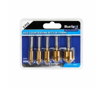The Blue Spot Tools 5 PCE HSS Countersink Bits (8-19mm) are manufactured from heat treated carbon steel for increased durability, they feature a titanium nitride coating to maximise the longevity of the bits. The set is ideal for use with power tools and is suitable for drilling in wood, plastics, steel, aluminium, copper and other non-ferrous metals.