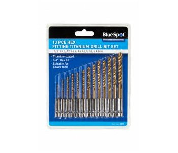 The BlueSpot 13 PCE Hex Fitting Titanium Drill Bit Set is manufactured from hardened steel with a titanium nitride coating for increased durability and improved performance. The drill bits have a 1/4"_ hex fitting which is suitable for most power tools.