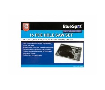 The BlueSpot 16 Piece 19mm - 127mm Hole Saw Set is ideal for non-ferrous metals, plasterboard, plastic and wood. Manufactured from heat-treated carbon steel for increased durability and cutting power. Includes handy carrying case for quick and convenient storage. Includes hex key and arbors.