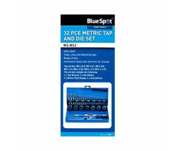 The Blue Spot Tools 32 PCE Metric Tap and Die Set (M3-M12) is manufactured from alloy steel and features a range of taps and dies for cutting and cleaning threads. There are three sizes of each tap: taper, plug & bottoming. The set also includes a range of dies.