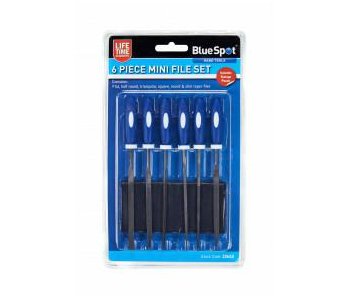 The BlueSpot 6 Piece Mini File Set With Pouch features six mini files ideal for hobby and detailed work in tight areas. Features soft grip handles for increased comfort. Includes handy carrying pouch for quick and convenient storage.