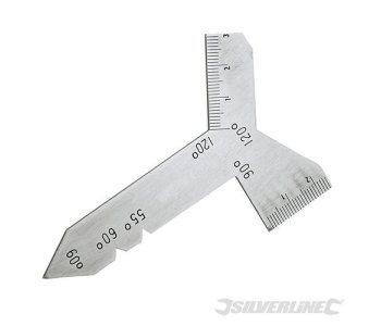 Universal Grinding Gauge. Stainless steel gauge marked with 55§, 60§, 90§ and 120§ angles. Etched, metric graduations.
