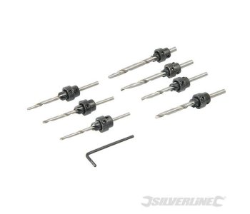 7pce Drill & Countersink Set. Milled and ground HCS steel drill bits. Coated for increased corrosion resistance. Drills clearance holes and countersink in one operation. Ready fitted with high performance wood drill bit. Sizes: 3, 3.5, 4, 4.5, 5, 5.5 and 6mm. Includes hex key and blow-moulded case.