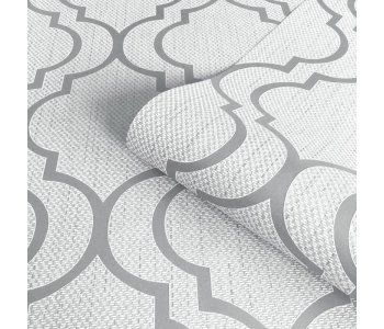 This wallpaper features a textured light grey background with a beautiful silver shimmering trellis design that is sure to elevate the look of any room.