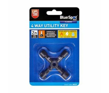 The Blue Spot Tools 4 Way Utility Key is manufactured from zinc alloy for increased durability. Blackened phosphate coating protects against corrosion. Opens service cabinets for water, electricity and gas.