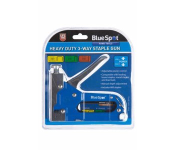 The Blue Spot Tools Heavy Duty 3-Way Staple Gun is designed for firing standard staples, round staples and brad nails. Spring-loaded slide strip magazine for quick staple reloading. Palm squeeze trigger provides simple and easy operation. Features manual depth adjustment control knob. Suitable for use with 4-14mm staples, 10-12mm U-Shape staples and 10-14mm brad nails. Includes 200 x 8mm staples, 200 x 12mm U-shape staples and 200 x 10mm nails.