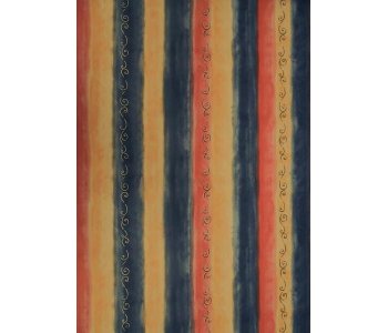 This multi-coloured stripe wallpaper features alternating shades of blue, red, and orange, accented with a whimsical gold swirl design.
