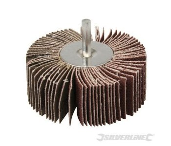 Flap Wheel.Use on wood, metal, paint and plastic for surface treatment, smoothing corners, deburring and structuring. Suitable for use with drills and straight grinders with collets. 6mm arbor.