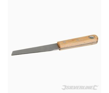 Single-piece, solid-forged steel hacking blade with ergonomic beech handle, riveted for strength. Removes putty and sealant from window frames, allowing clean removal of glass. Thick, full-tang steel offers excellent weight for effortless putty removal. Hanging hole for storage.