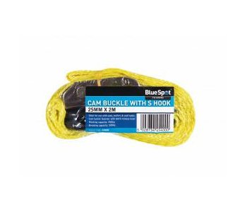 The BlueSpot S Hook Cam Buckle (25mm x 2m/6ft) is manufactured from polyester webbing for weather resistance and has stitched reinforcement for increased durability with plastic coated, steel S hooks for corrosion protection. The cam buckle is ideal for the securing of large, bulky or awkwardly shaped loads during transportation. The automatic locking cam has a quick release function for quick and easy use and the polyester webbing is resistant to cutting and friction abrasion.
