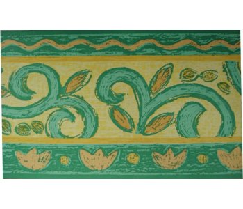 468-43 Holmes Wallpapers Border. Green background with orange wobbly line on upper edge of border with orange tulip style flower on a green background on the lower edge. Light orange background with swirly green stem and orange leaves in the foreground. 5m in length, 14.5cm in height. pattern repeat 26.5cm.