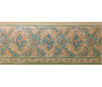 Vymura wallpaper border self adhesive in a light blue and green and dark yellow decroative design. Pattern repeat 13cm. 5 meters in length, 10.5cm in height.