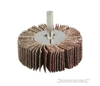 Flap Wheel.Use on wood, metal, paint and plastic for surface treatment, smoothing corners, deburring and structuring. Suitable for use with drills and straight grinders with collets. 6mm arbor.