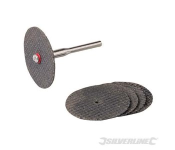 Resin-bonded aluminium oxide discs for cutting, trimming and deburring. For use on metals, alloys, plastics, fibreglass and wood. Compatible with most rotary tools including Silverline, GMC and Dremel. Includes 5 x 31mm discs and 3.17mm mandrel. Max 28,000rpm.