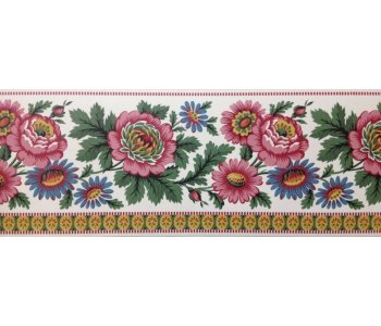 Village vinyl pre-pasted wallpaper border.A nice colouful border in pink and blue flower pattern with cream background. Pattern repeat 18cm. 5 meters in length, 10.5 cm in height.
