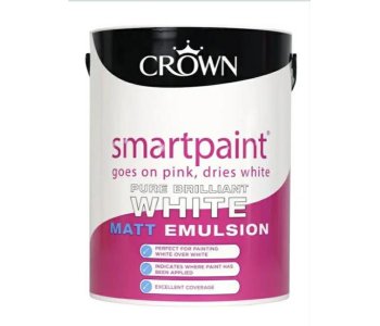 Crown Smartpaint matt emulsion pure brilliant white has been developed to help you get a perfectly white, patch free finish on interior ceilings & walls. It goes on pink during application and is formulated to fade from pink to white in under one hour, perfect when painting white over white.