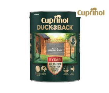 Cuprinol Ducksback 5 Year Waterproof for sheds and fences, in Misty Heathland colour, has an advanced, wax enriched, formulation which colours and weather protects rough sawn garden wood for up to 5 years.