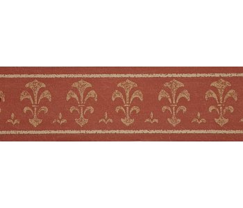 The image shows a decorative border with a classic fleur-de-lis pattern. The background is a rich, textured red, while the fleur-de-lis motifs are rendered in a contrasting gold colour. These motifs are evenly spaced and repeated along the length of the border, creating a rhythmic and symmetrical design. The top and bottom edges of the border feature a thin, irregular gold line that adds a touch of detail and frames the central pattern nicely.