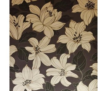 Transform your walls with this exquisite wallpaper featuring a charming gold lily motif with charcoal coloured leaves on a dark brown background.