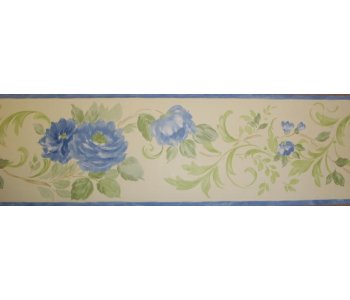 Sky blue stripe on edges, cream background with sky blue/ white flowers and green (with a hint of brown) leaves/ stems.