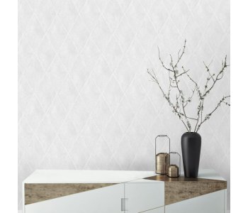 Introducing the stunning 65340 Etna Dove Diamond with White stripe Wallpaper, a sophisticated addition to any space. This wallpaper features a timeless white and dove grey diamond design with a touch of elegance provided by the white stripe on a shimmering silver background.