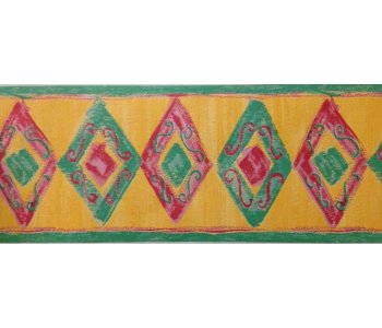 657-43 Holmes wallpaper border in a green and red modern diamond design with a yellow background and green trims. Pattern repeat 26.5cm. 5 meters in length, 13 cm in height.