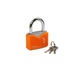 Rhombic designed padlock with a chrome plated iron body, a protective plastic jacket for resilience and toughness and a 58mm long shackle.