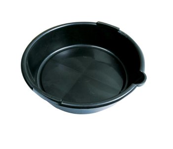 Oil Drain Pan. Black plastic, oil drain pan with pouring spout for clean disposal of oils and engine fluids. Catches drips as you work, and protects driveways and garage floors from staining. Capacity 6Ltr. Depth 90mm.