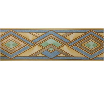 The 6801 13Metres Zen Montereau Design Wallpaper Border features a stylish diamond pattern in yellow, blue, green, gold, and cream colours.